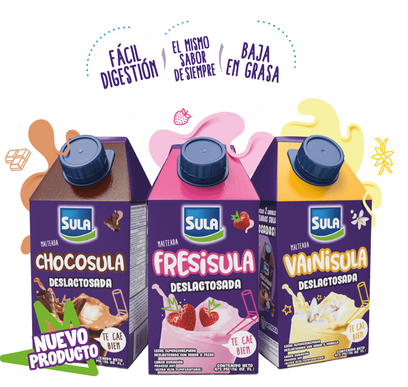 Las malteadas Sula han cambiado de imagen, también de leche entera a leche deslactosada para el beneficio de un porcentaje de nuestros consumidores, pero aún conservan el mismo sabor que tanto les gusta a nuestros clientes, las malteadas deslactosadas de Sula las puedes encontrar en tres sabores diferentes: Chocolate, Fresa y Vainilla.